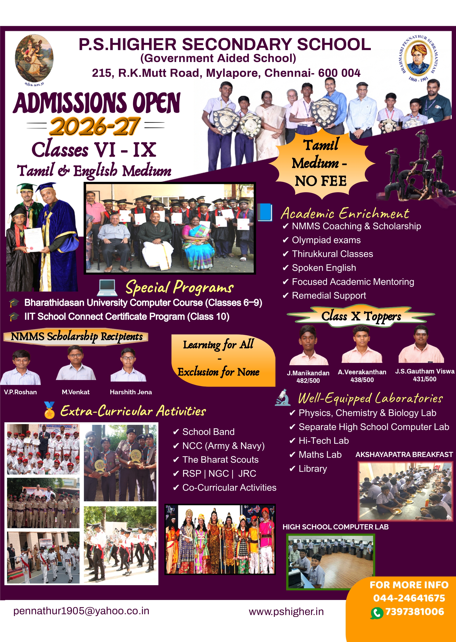 I was a student of the P.S.High School from 1962 to 1968. In one of the meetings, the Commissioner of Police began his address as ‘Students of the great and glorious School’. All of us clapped continuously for five minutes. Unforgettable memories. Thanks to Pennathur Subramaniam Iyer, a great visionary, the school continuously holds its prestigious place in Mylapore. I cannot forget those years when the teachers were strict inside the classroom and highly compassionate outside the class room. In particular, I would like to mention Shri Kuppuswamy Iyer, Shri Narasimhachariar and Shri Harihara Sharma. Apart from the subjects they taught, they were role-model for integrity, honesty and humility. These qualities helped me in my career as a Chartered Accountant and as a Teacher. The Educational system has undergone big changes and today there are many challenges in imparting quality education. I wish my continued success in preserving the culture of the school and at the same time improving the quality.